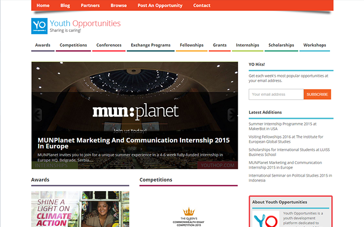 Youth Opportunities is an open platform of sharing of opportunities and knowledge with the mass people: internships, scholarships, competitions, conferences, student events, project grants.
